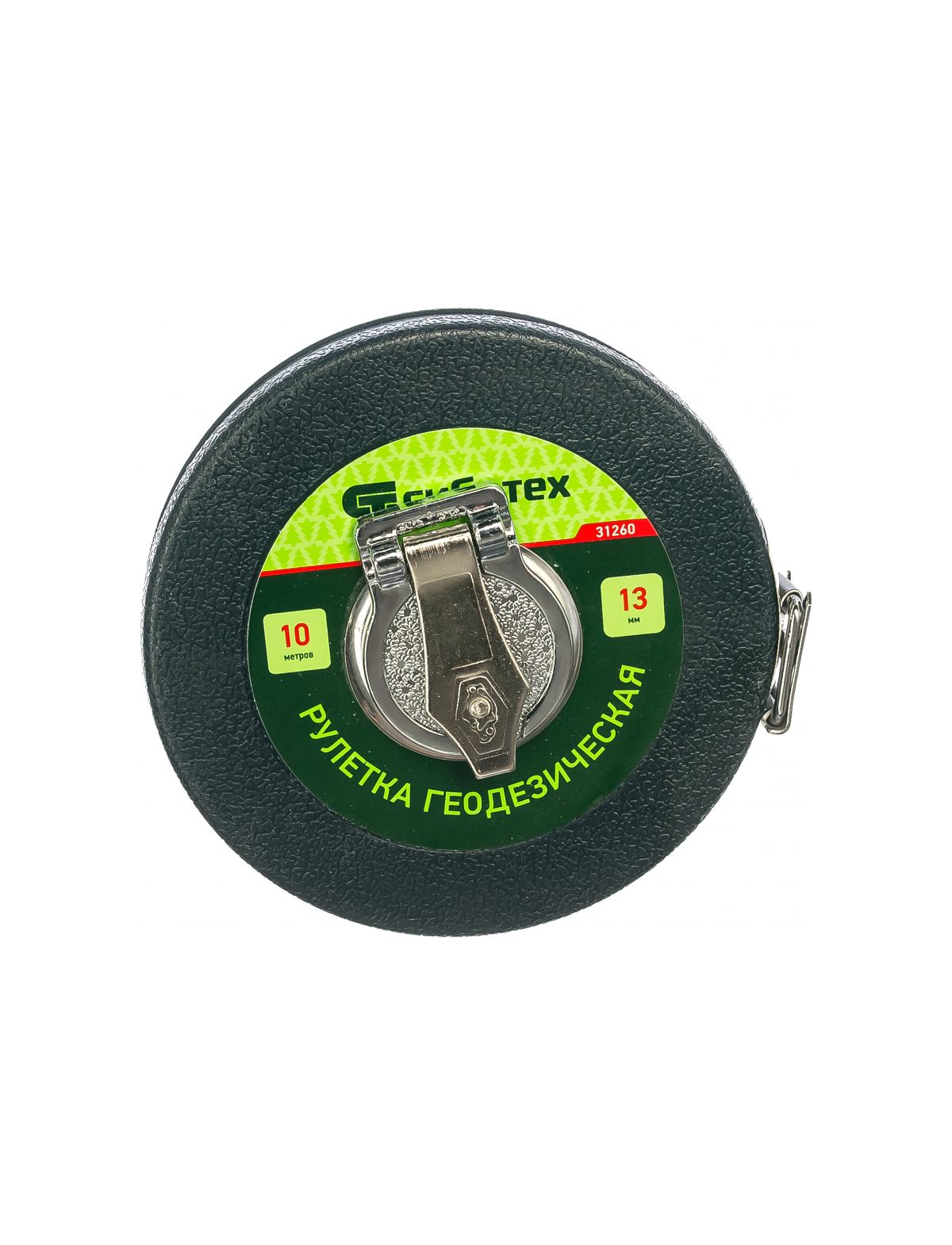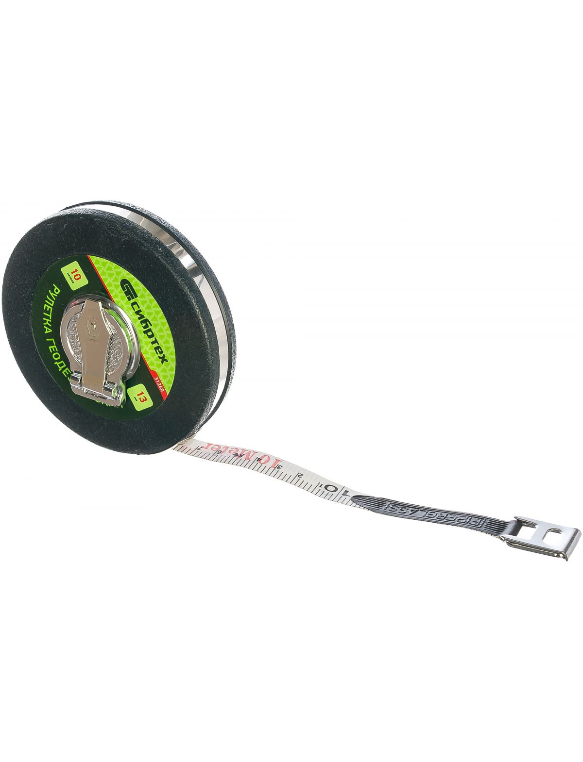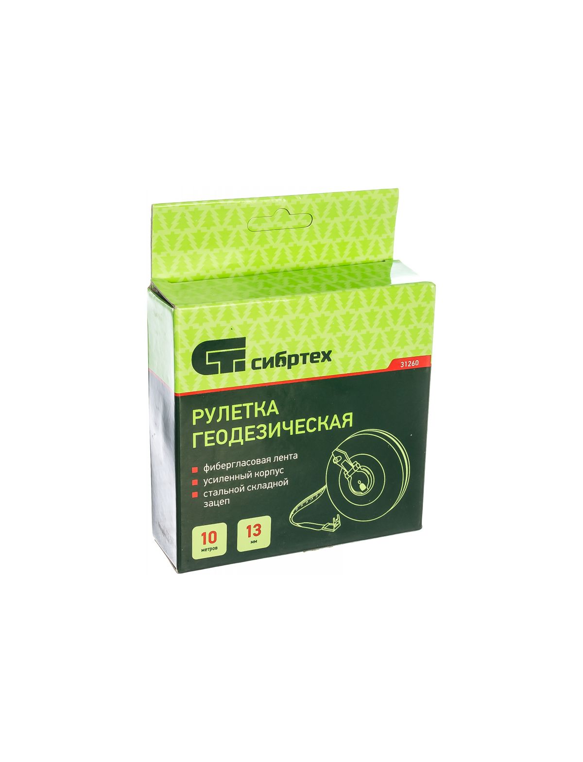 Геодезическая рулетка СИБРТЕХ 10 м х13 мм 31260 - это измерительный инструмент при проведении строительных и геодезических работ. Рулетка расположена в закрытом корпусе, изготовленном из ударопрочного АБС-пластика, усиленного стальной лентой. Механизм скручивания открывается с кнопки и расположен сбоку конструкции. Фибергласовая лента имеет на конце стальной складной зацеп.