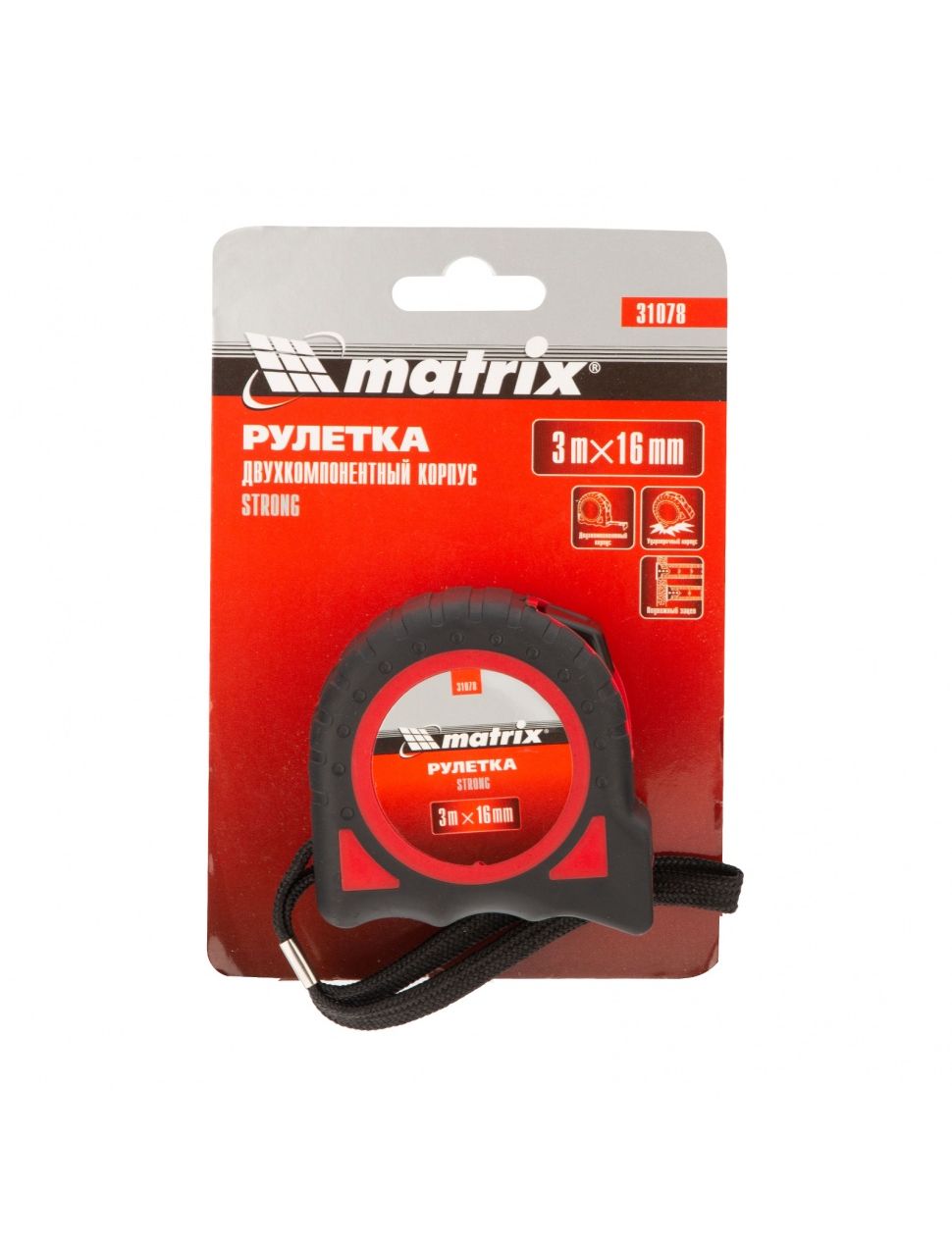 Рулетка 3 м х 16 мм Strong обрезиненный корпус MATRIX 31078