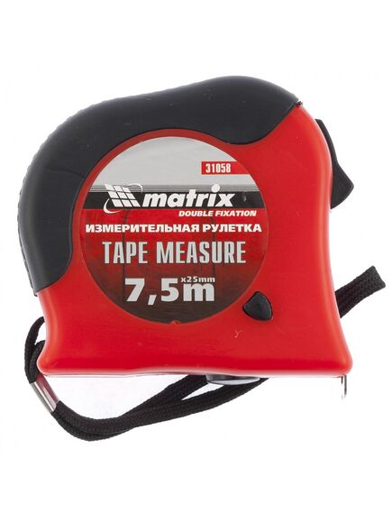 Рулетка 7,5 м х 25 мм Double fixation MATRIX 31058 - ручной инструмент с обрезиненным корпусом для проведения точных замеров длин и расстояний. Полотно покрыто полимером, что увеличивает стойкость к истиранию. Механизм фиксации способствует удержанию ленты на нужной длине.