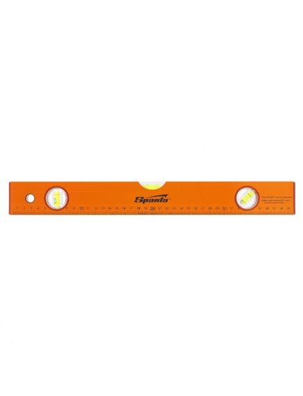 Алюминиевый уровень с линейкой 400 мм SPARTA 330205 - это удобный и точный измерительный инструмент. Разметка, нанесенная на корпус, позволяет с легкостью проводить измерительные и разметочные работы. Корпус инструмента выполнен из прямоугольного алюминиевого профиля. Модель оснащена тремя встроенными глазками из акрила, которые позволяют проверять поверхности в трех плоскостях: по горизонтали, вертикали и под углом в 45°.