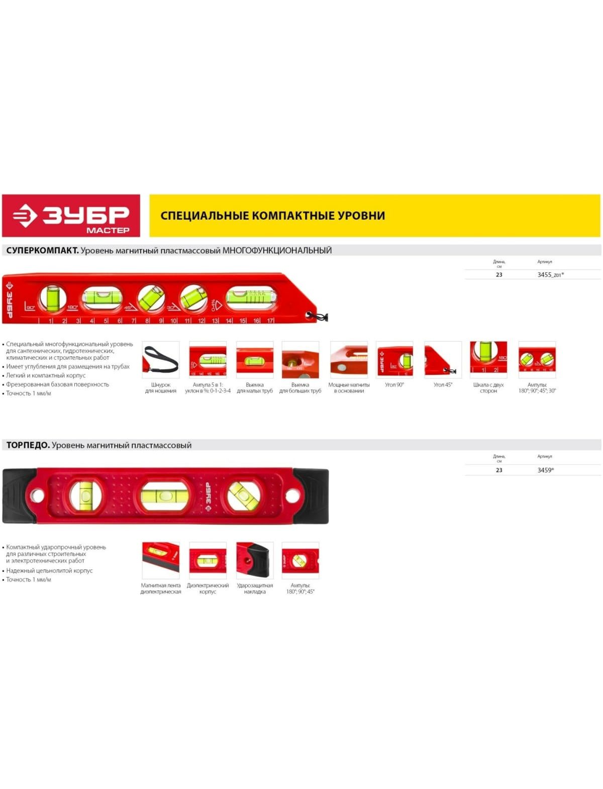 Уровень компакт 230 мм "Торпедо" магнитный ЗУБР 3459