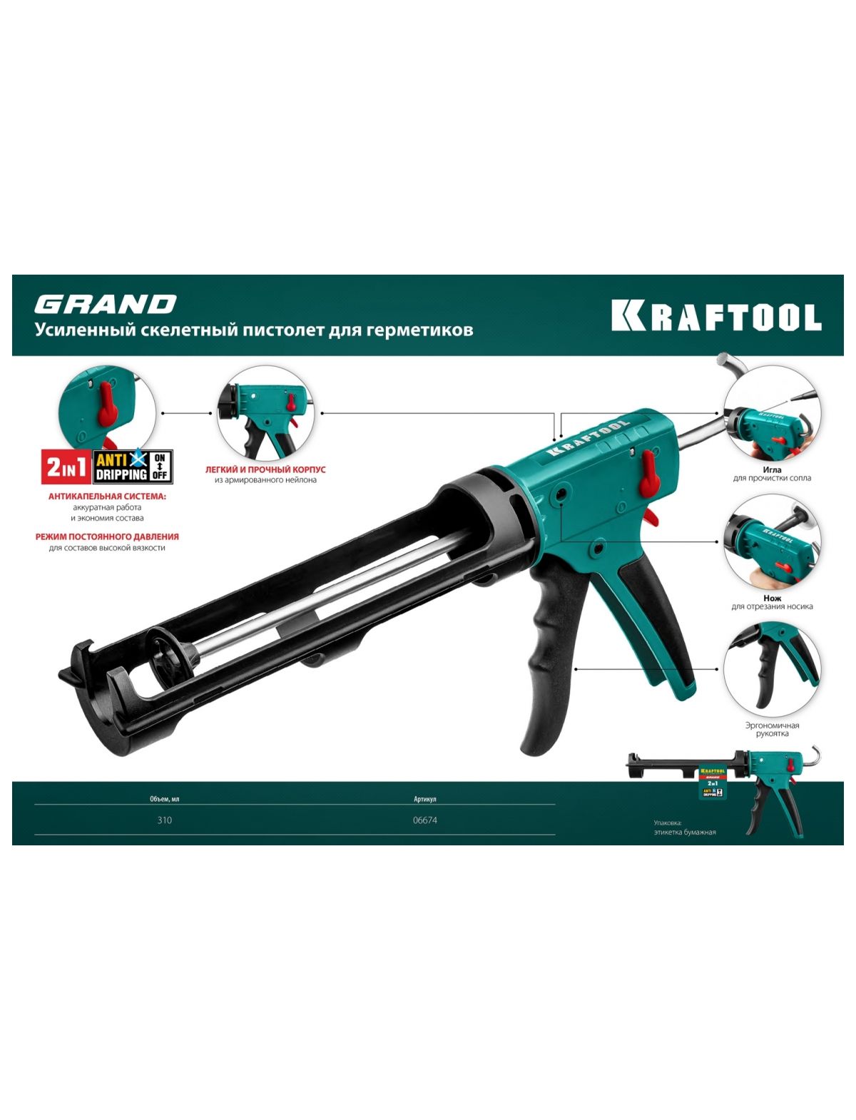 Скелетный пистолет для герметика KRAFTOOL 310 мл 06674 подходит для работы с картриджами объемом 310 мл. Имеет усиленный скелетный корпус, что гарантирует долгий срок службы. Круглый шток из оцинкованной стали способствуют равномерной подачи клея либо герметика. Данная спецификация обеспечивает прочность и надежность конструкции пистолета при использовании. Оснащен иглой для удаления застывшего герметика/клея и встроенным резаком для сопла.
