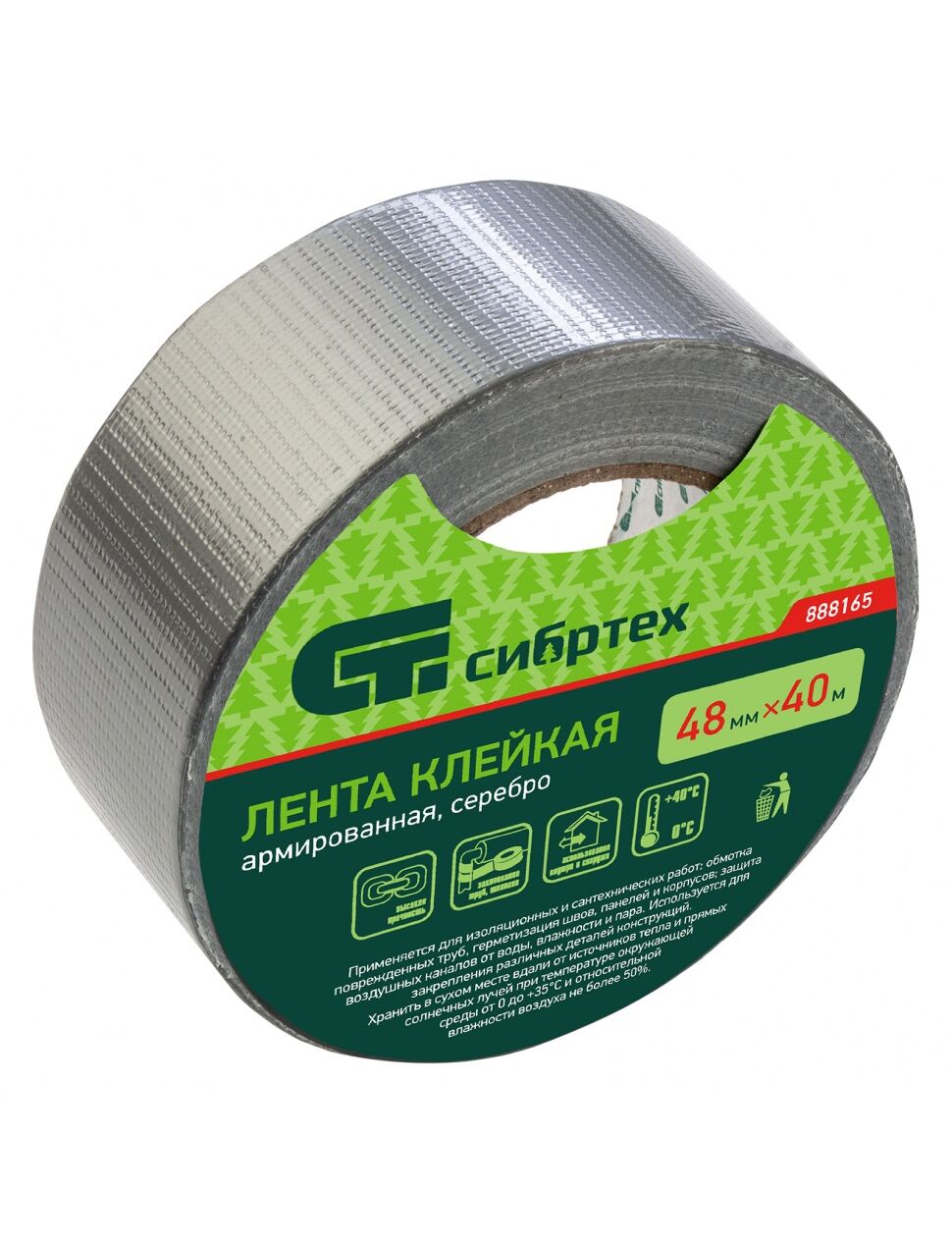 Клейкая армированная лента Сибртех 888165 размером 48 мм х 40 м, цвета серебра, используется для проведения изоляционных, сантехнических и монтажных работ. Применяется для обмотки поврежденных труб, герметизации швов, панелей и корпусов. Обеспечивает надежную изоляцию от влажности и пара. Позволяет также закреплять детали различных конструкций.