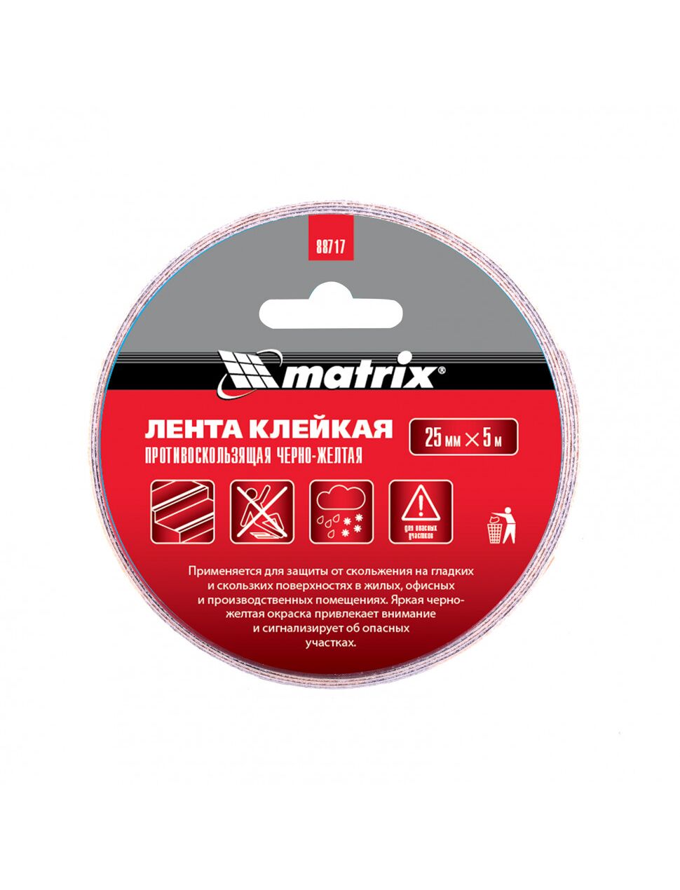Клейкая противоскользящая лента Matrix 88717 черно-желтого цвета, 25 мм х 5 м, предназначена для предотвращения несчастных случаев на скользких поверхностях: лестницах, кафельном полу и т.д. С ее помощью можно обезопасить людей в местах с большой проходимостью: общественных зданиях, многоквартирных домах, на производстве, в магазине. Ленту следует клеить на очищенные сухие поверхности при температуре выше +12 градусов.