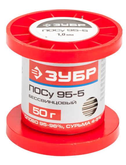 Припой ПОСу 95-5 Зубр 55455-050-10 применяется для пайки трубопроводов, работающих при повышенных температурах, тонколистовой упаковки. Содержит около 95% олова, 5% сурьмы. Соответствует ГОСТ 21931-76.