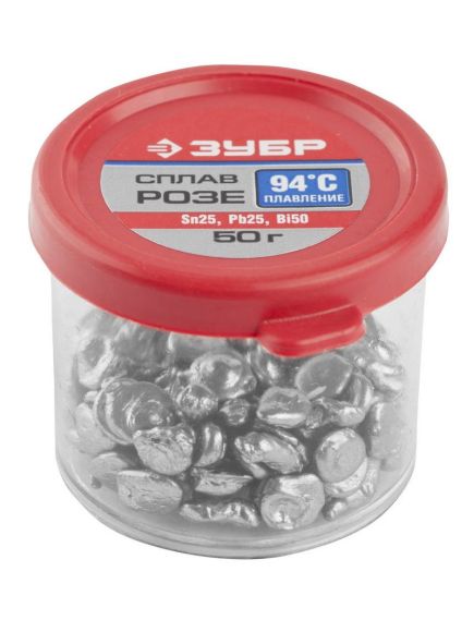Сплав РОЗЕ Зубр 55457-050 применяется для предварительной пропайки контактов, пайки микрофонов и термочувствительных элементов, лужения печатных плат. Содержит около 25% олова, 25% свинца, 50% висмута. Соответствует ГОСТ 21931-76.