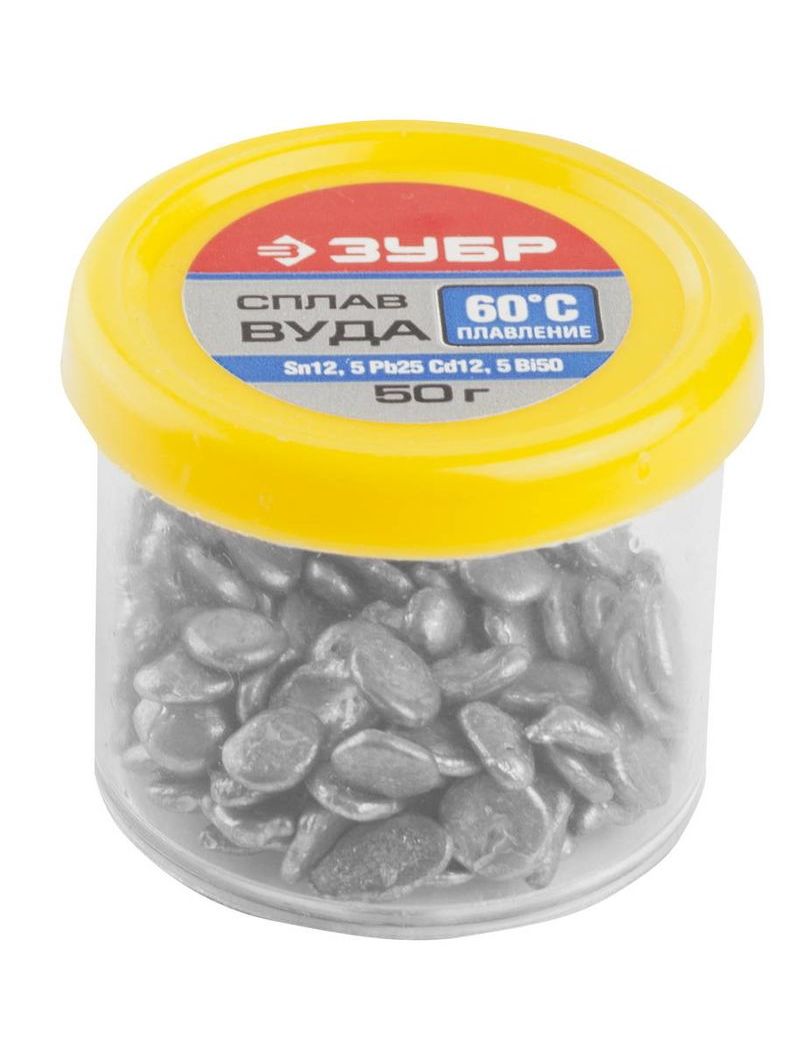 Сплав ВУДА Зубр 55458-050 применяется для предварительной пропайки контактов, пайки микрофонов и термочувствительных элементов, лужения печатных плат. Содержит около 12.5% олова, 25% свинца, 12.5% кадмия, 50% висмута. Соответствует ГОСТ 21931-76.