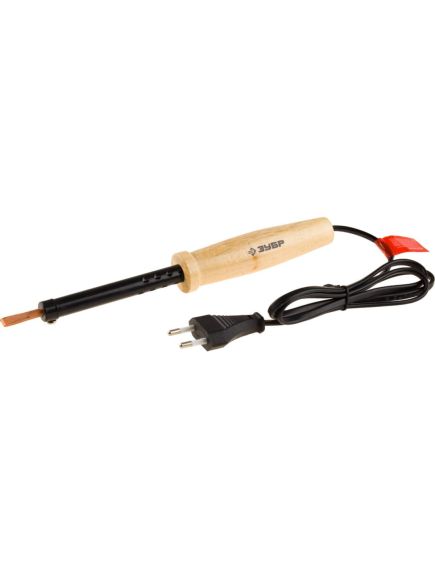 Электропаяльник ЗУБР МАСТЕР с деревянной рукояткой и долговечным жалом, форма клин 60Вт 55405-60 предназначен для нагрева деталей, флюса, расплавления припоя и внесения его в место контакта. Рукоятка выполнена из дерева. Жало в форме клина выполнено из меди.