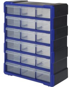 Подходит для хранения мелких деталей и предметов • Ящички из полупрозрачного полипропилена 18шт • Сверху, снизу и сбоку пазы для крепления дополнительных секций • Удобный, прочный и легкий в переноске • Размер : 475х380х160мм