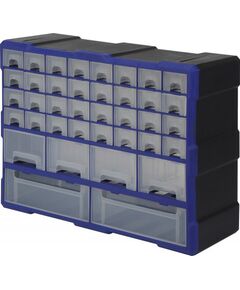 Подходит для хранения мелких деталей и предметов • Ящички из полупрозрачного полипропилена 38шт • Сверху ,снизу и сбоку пазы для крепления дополнительных секций • Удобный, прочный и легкий в переноске • Размер : 520х160х375мм