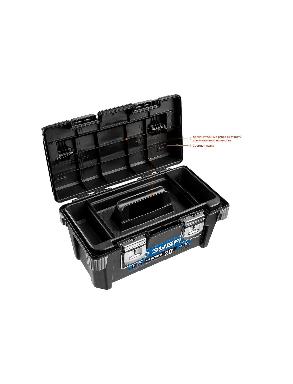 Пластмассовый ящик "УМЕЛЕЦ" для инструмента 38141-20 Зубр используется для удобной переноски и хранения различного ручного инструмента. Внутри ящик оснащен удобной полочкой. Имеется два металлических замка, что гарантирует безопасное хранение инструмента. Прочная алюминиевая ручка выдержит любые нагрузки. Полипропилен использованный при изготовлении корпуса ящика отвечает за его небольшую массу, а значит удобство при транспортировке, а металлические составляющие обеспечивают прочность и устойчивость к нагрузкам.