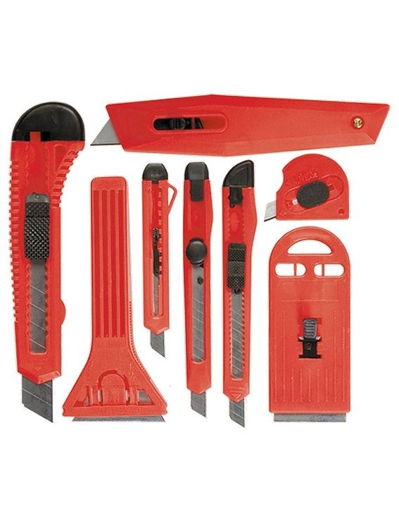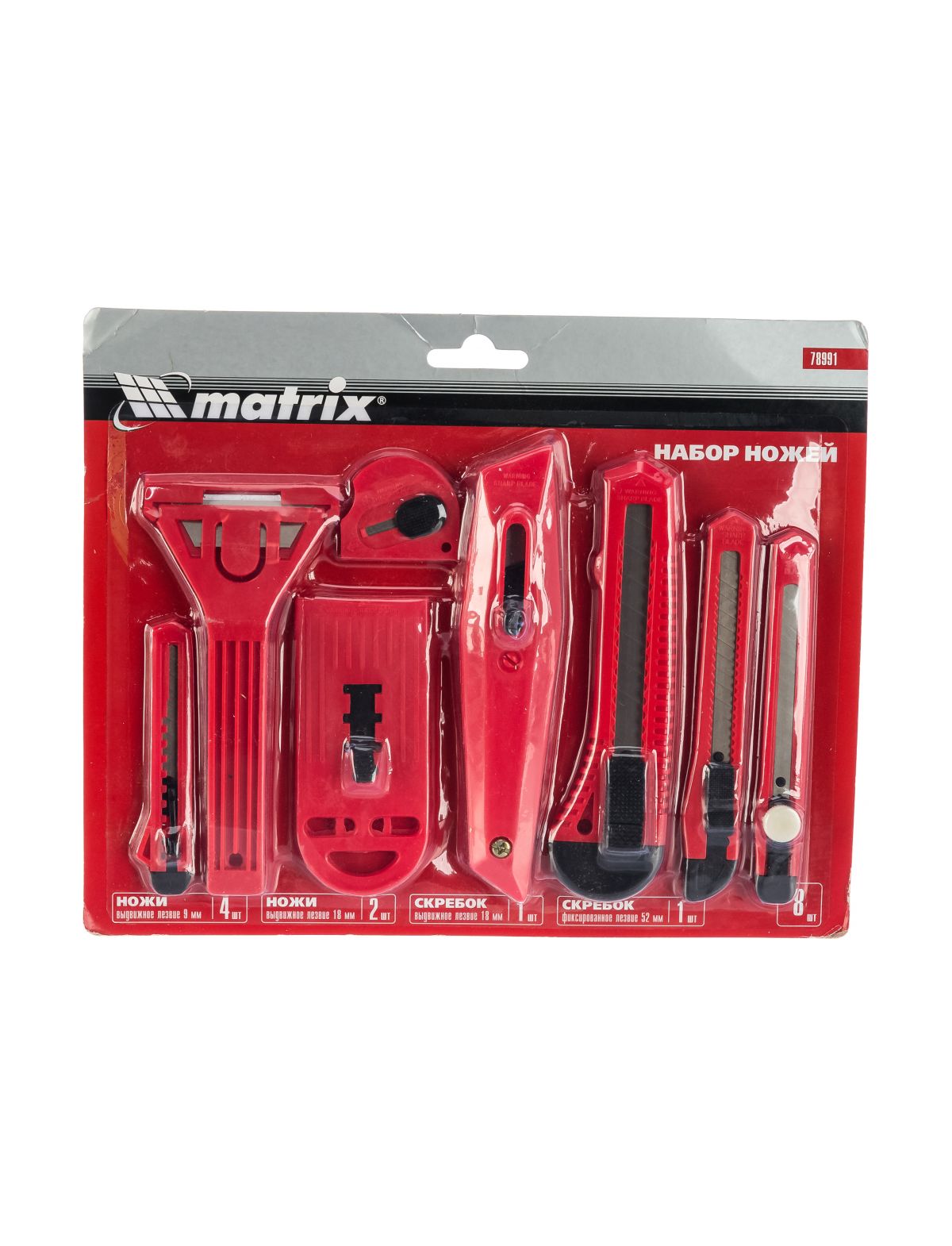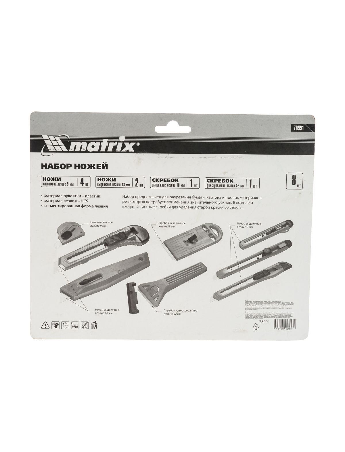 Набор ножей с выдвижными лезвиями MATRIX 78991 предназначен для разрезания бумаги, картона и прочих материалов, для резания которых не требуется применение значительных усилий. Такой комплект содержит в себе ножи различного применения с пластмассовыми ручками. В комплект входят зачистные скребки для удаления старой краски со стекла.