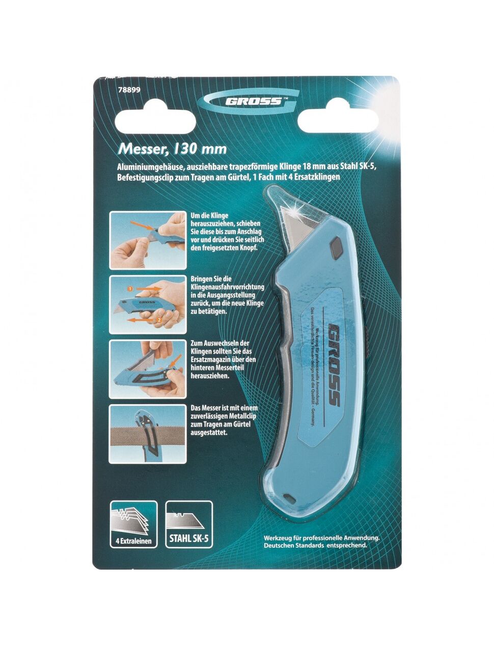 Нож 130 мм, алюминиевый корпус, выдвижное трапецевидное лезвие 18 мм GROSS 78899 используется для разрезания материалов в ходе ремонтных и отделочных работ. Рабочая часть выполнена из стали и отличается высокой прочностью и износоустойчивостью. Для удобства пользователя предусмотрена кнопка быстрой замены лезвий. Наличие в корпусе ножа диспенсера облегчает хранение запасных лезвий. В комплекте поставляется 4 запасных лезвия.