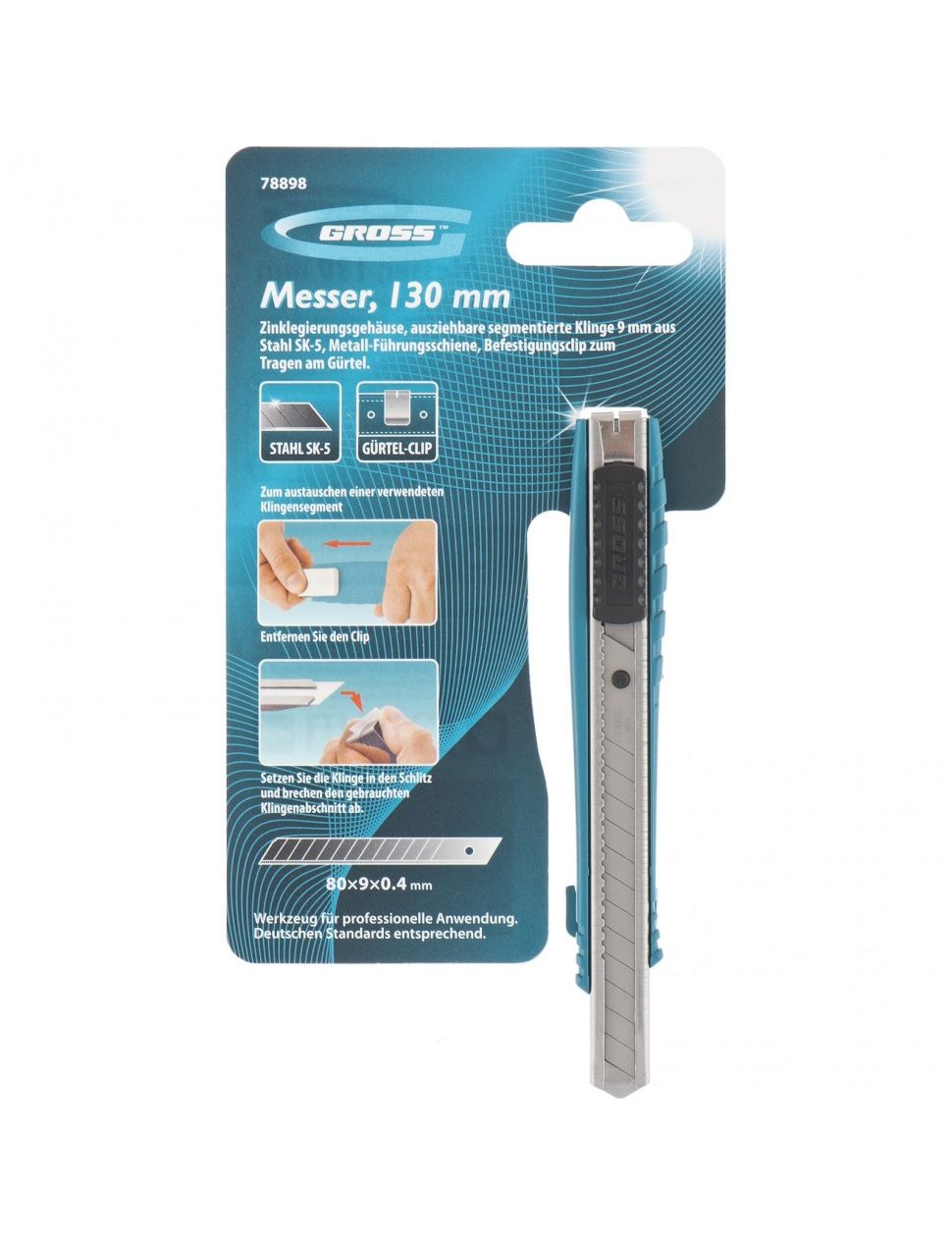 Нож 130 мм, металлический корпус, выдвижное сегментное лезвие 9 мм GROSS 78898 используется в ходе отделочных и ремонтных работ для разрезания различных материалов (обои, картон, линолеум и др.). Изделие обладает высокой прочностью, имеет стальное лезвие и металлическую направляющую.