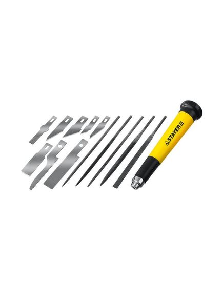 Нож STAYER “MASTER” для точных работ в комплекте с лезвиями различной формы и надфилями, в чехле,38 предметов 09145-H38 подойдет для часовщиков и ювелиров, а также выполнения широкого спектра работ. Удобная рукоять имеет специальное противоскользящее покрытие. Пильные полотна с различным количеством зубьев обеспечивают чистый пропил. Выполнены из инструментальной стали.
