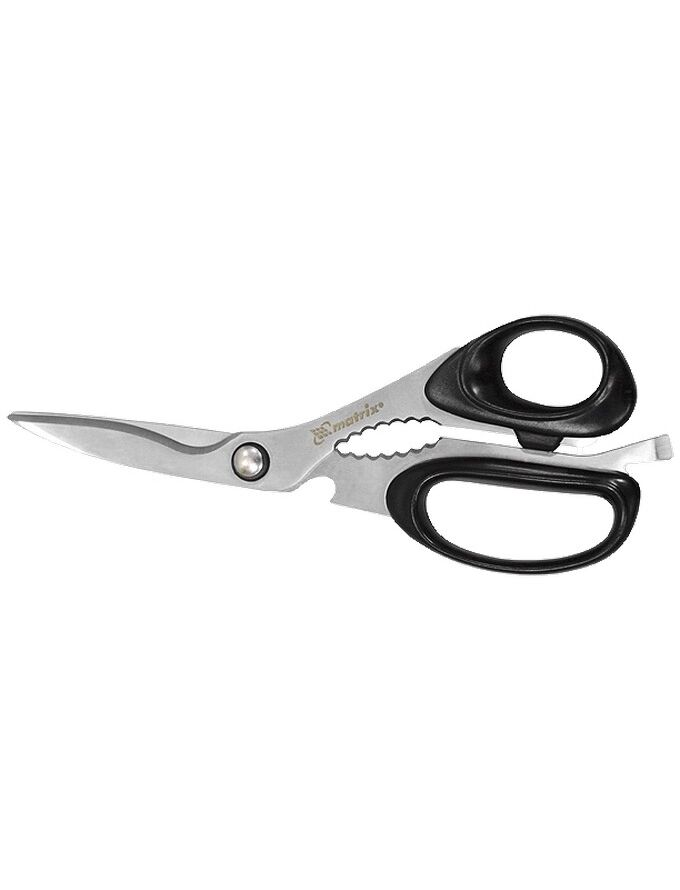 Многофункциональные хозяйственные ножницы Matrix KITCHEN 79136 длиной 200 мм способны решить множество бытовых задач. Будут полезны на кухне, во время занятий рукоделием или мелким ремонтом. Не только режут бумагу, картон и ткань, но и разделывают птицу или рыбу, а также выполняют функцию отвертки. Изогнутая форма повышает комфортность использования инструмента.