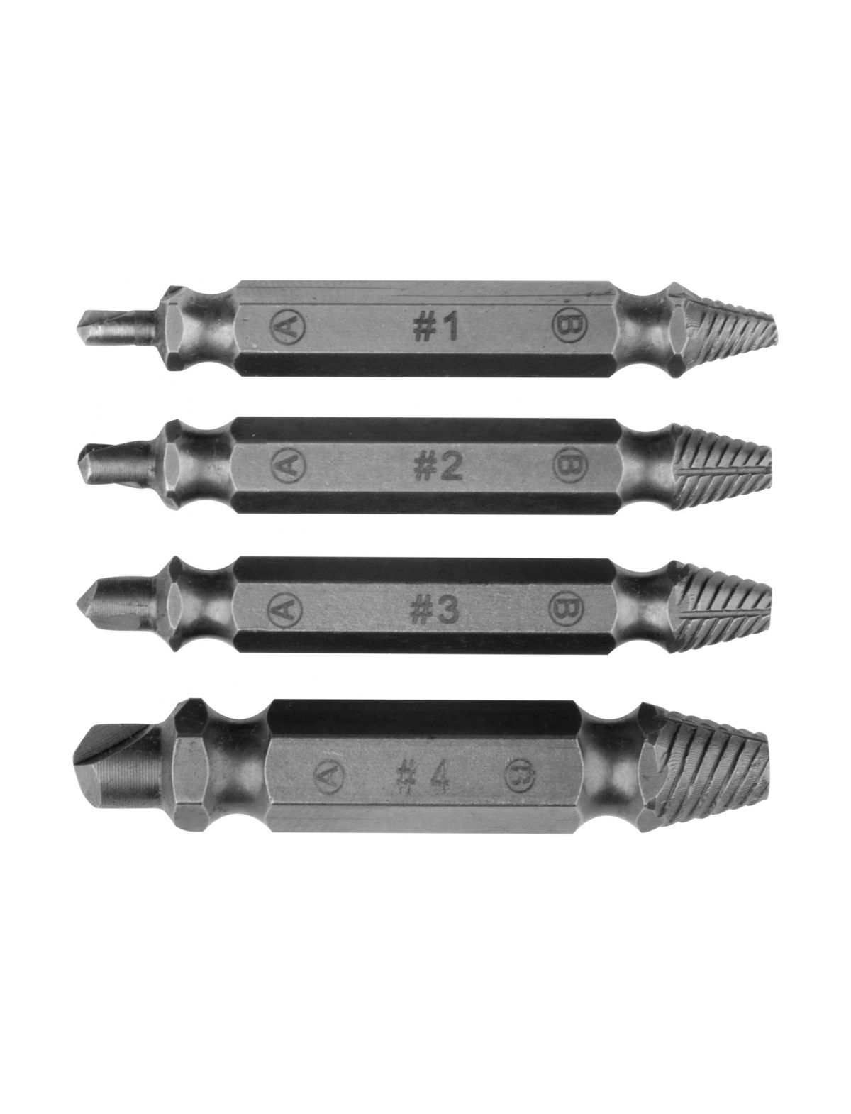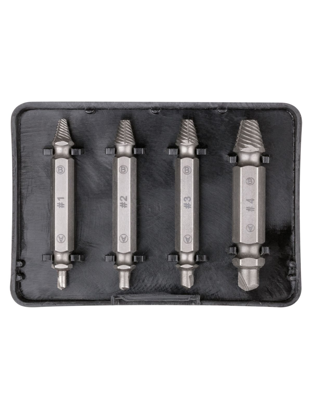 Набор двусторонних экстракторов, сталь S2, 4 штуки FIT 36452 используется для удаления крепежа с сорванными шлицами. В комплекте находятся двусторонние экстракторы для работы с РН/PZ1,2,3,4 (сторона А) и любым другим крепежом (сторона Б).