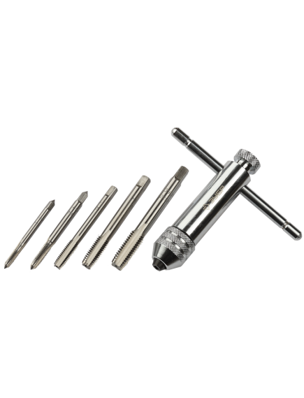 Набор включает в себя метчикодержатель и метчики различного размера, которые используются при выполнения метрической внутренней резьбы в заготовках. Инструмент подходит для работ по таким материалам, как сталь, цветные металлы и т.д. Материал приспособлений сталь высокого качества, предназначенная специально для изготовления подобного инструмента и отличающаяся стойкостью к высоким температурам и ударным нагрузкам. Для удобства использования метчикодержатель имеет Т-образную конструкцию, а его рукоятка фиксируется.