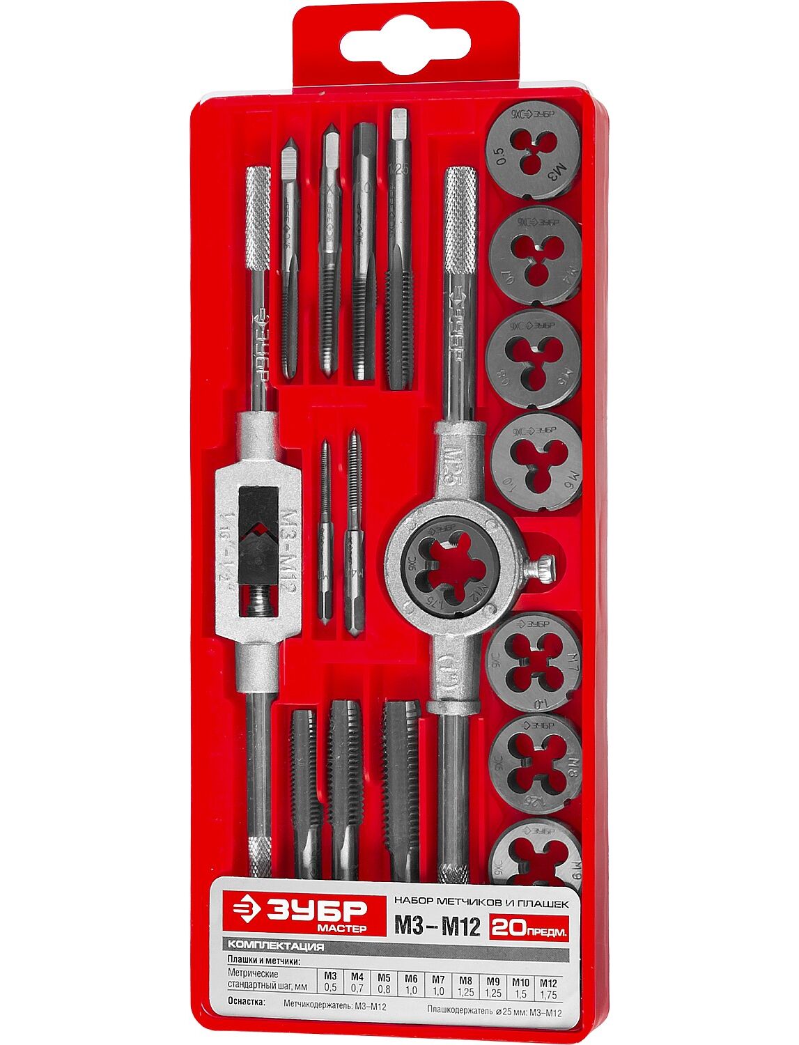 Набор ЗУБР с металлорежущим инструментом, метчики однопроходные и плашки М3-М12 2810-H20_z01 - комплект из 20 профессиональных инструментов, которые используются для нарезки различных видов резьбы (метрической, внешней и др.). Выполнены из инструментальной легированной стали 9ХС и обладают высокой прочностью.