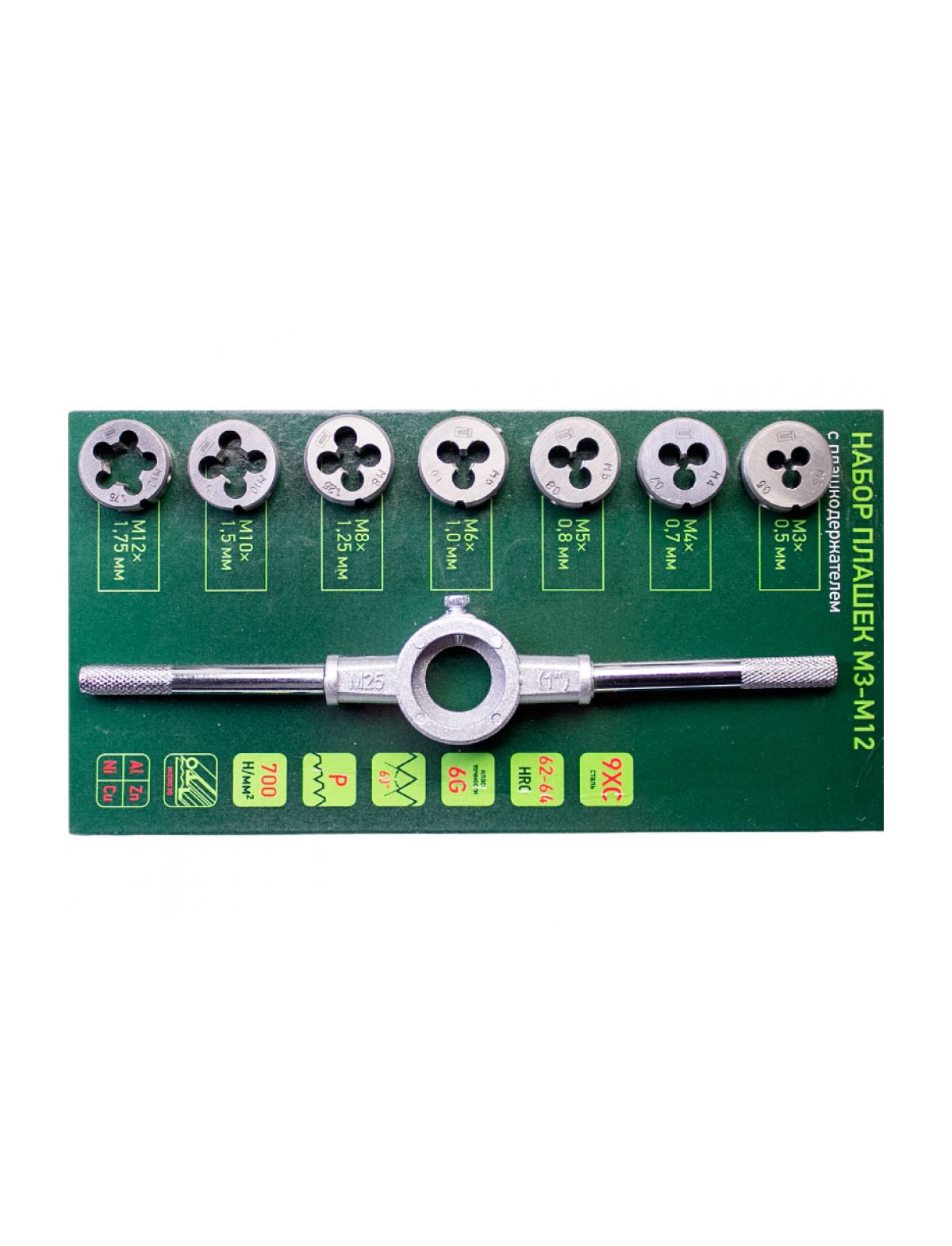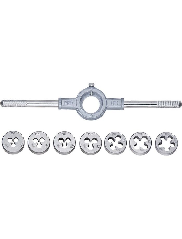Плашки: М3x0.5, М4x0.7, М5x0.8, М6x1.0, М8x1.25, М10x1.5, М12x1.75