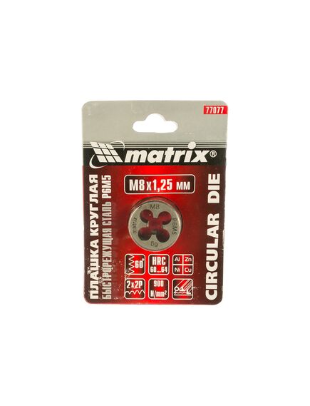 Плашка М8х1.25 мм MATRIX 77077 пригодится в мастерской или на производстве для нарезания внешней резьбы. Данное приспособление изготовлено из прочной быстрорежущей стали, поэтому обладает высокой износостойкостью.