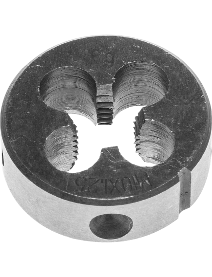 Круглая ручная плашка для нарезания метрической резьбы, мелкий шаг, Зубр "МАСТЕР" М10x1,25 4-28022-10-1.25 выполнена из легированной стали 9ХС. Сплав дополнен хромом, кремнием и углеродом для большей жесткости.