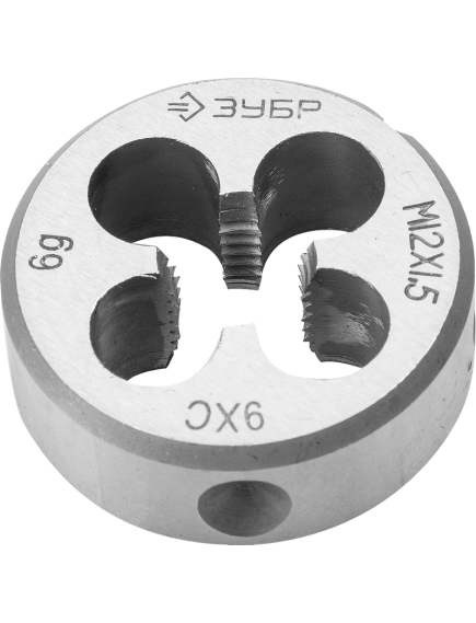 Круглая ручная плашка для нарезания метрической резьбы, мелкий шаг, Зубр "МАСТЕР" М12x1,5 4-28022-12-1.5 выполнена из легированной стали 9ХС. Сплав дополнен хромом, кремнием и углеродом для большей жесткости.