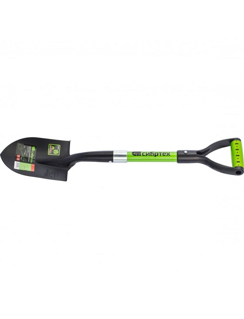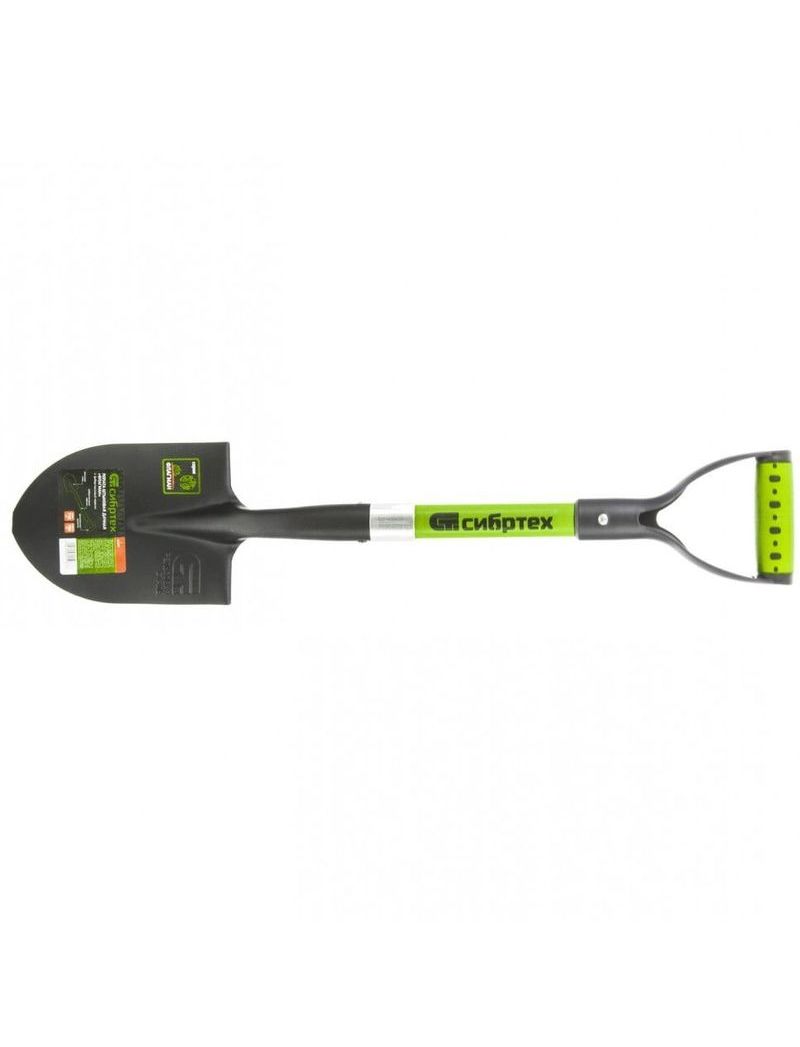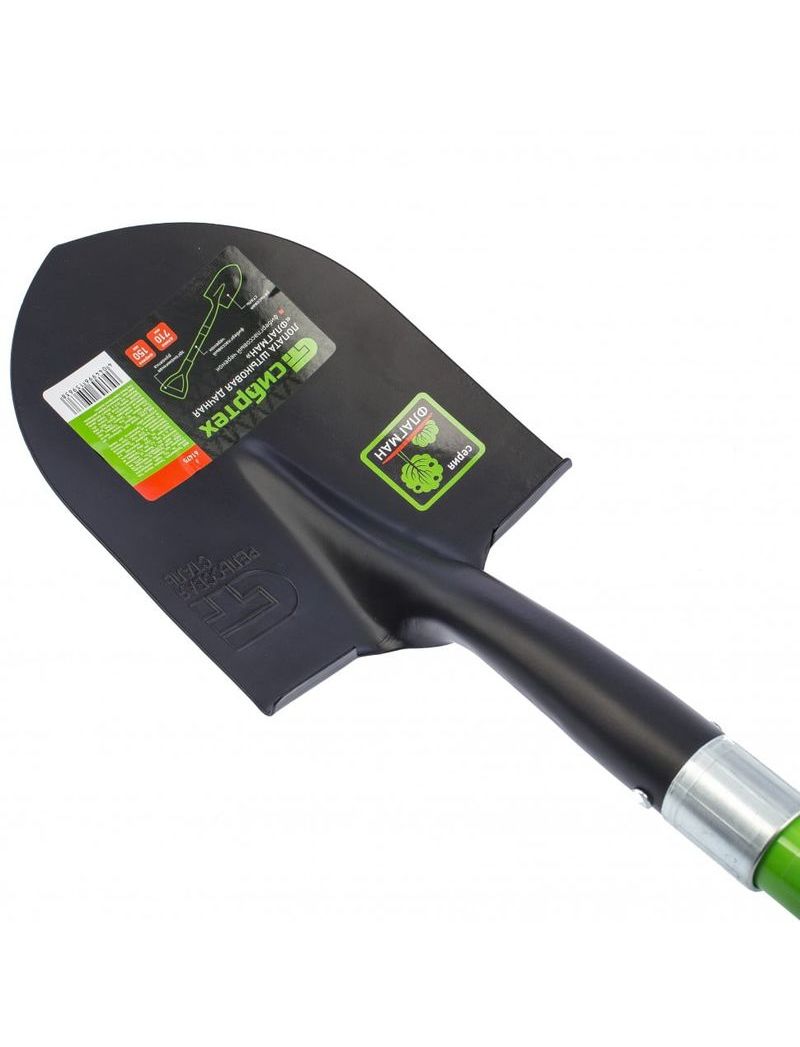 Лопата предназначена для работ с грунтом. Инструмент изготовлен из рессорно-пружинной стали и покрыт порошковой эмалью. Рабочая часть закалена. В сборе с фибергласовым черенком и пластиковой двухкомпонентной рукояткой.