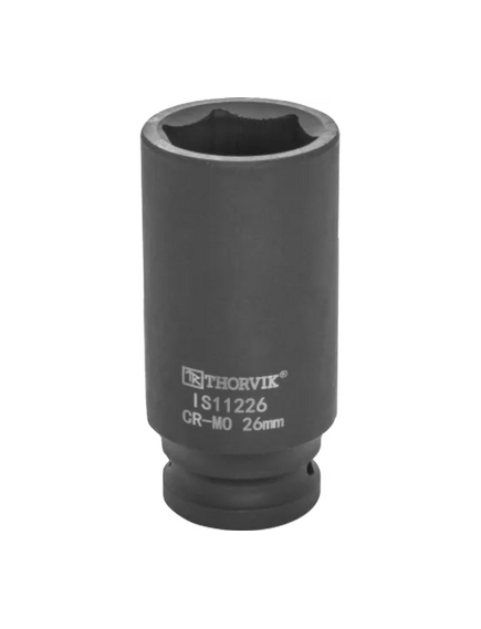 Головка торцевая ударная глубокая IS11226 26 мм, 1/2"DR Thorvik 53454 используется для монтажа/демонтажа резьбовых соединений. Предназначена для ударных гайковертов. Имеет увеличенную длину и применяется для работы со сложными деталями удлиненной или углубленной формы, а также для обслуживания крепежа в труднодоступных местах.