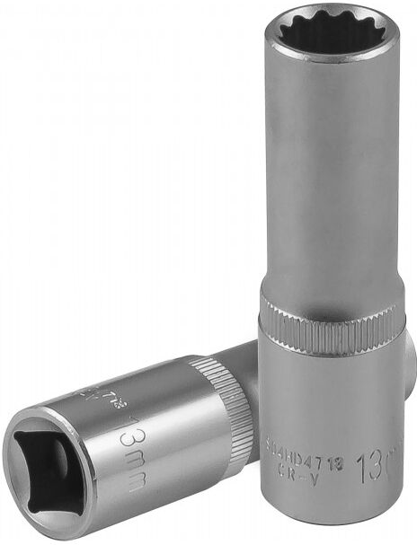 Головка торцевая глубокая 12-гранная 1/2"DR. Торцевая головка выполнена из хромованадиевой стали, имеет накатку и полуматовое хромоникелевое покрытие. Изделие изготовлено по стандарту DIN 3124, полностью соответствует требованиям ГОСТа 25604-83.
