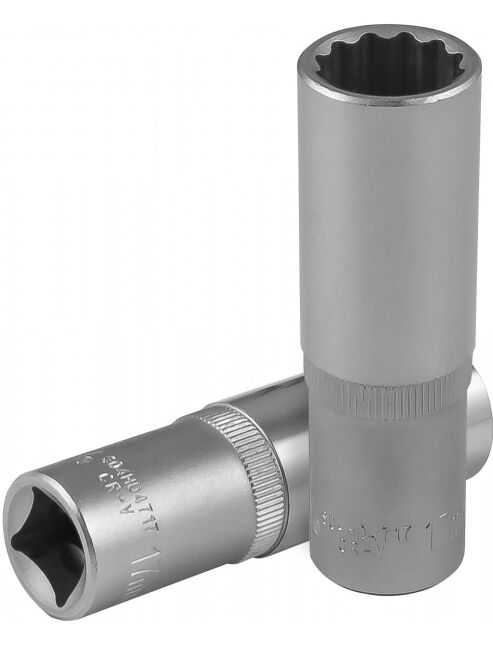 Головка торцевая глубокая 12-гранная 1/2"DR. Торцевая головка выполнена из хромованадиевой стали, имеет накатку и полуматовое хромоникелевое покрытие. Изделие изготовлено по стандарту DIN 3124, полностью соответствует требованиям ГОСТа 25604-83.