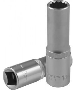 Головка торцевая глубокая 12-гранная 1/2"DR. Торцевая головка выполнена из хромованадиевой стали, имеет накатку и полуматовое хромоникелевое покрытие. Изделие изготовлено по стандарту DIN 3124, полностью соответствует требованиям ГОСТа 25604-83.