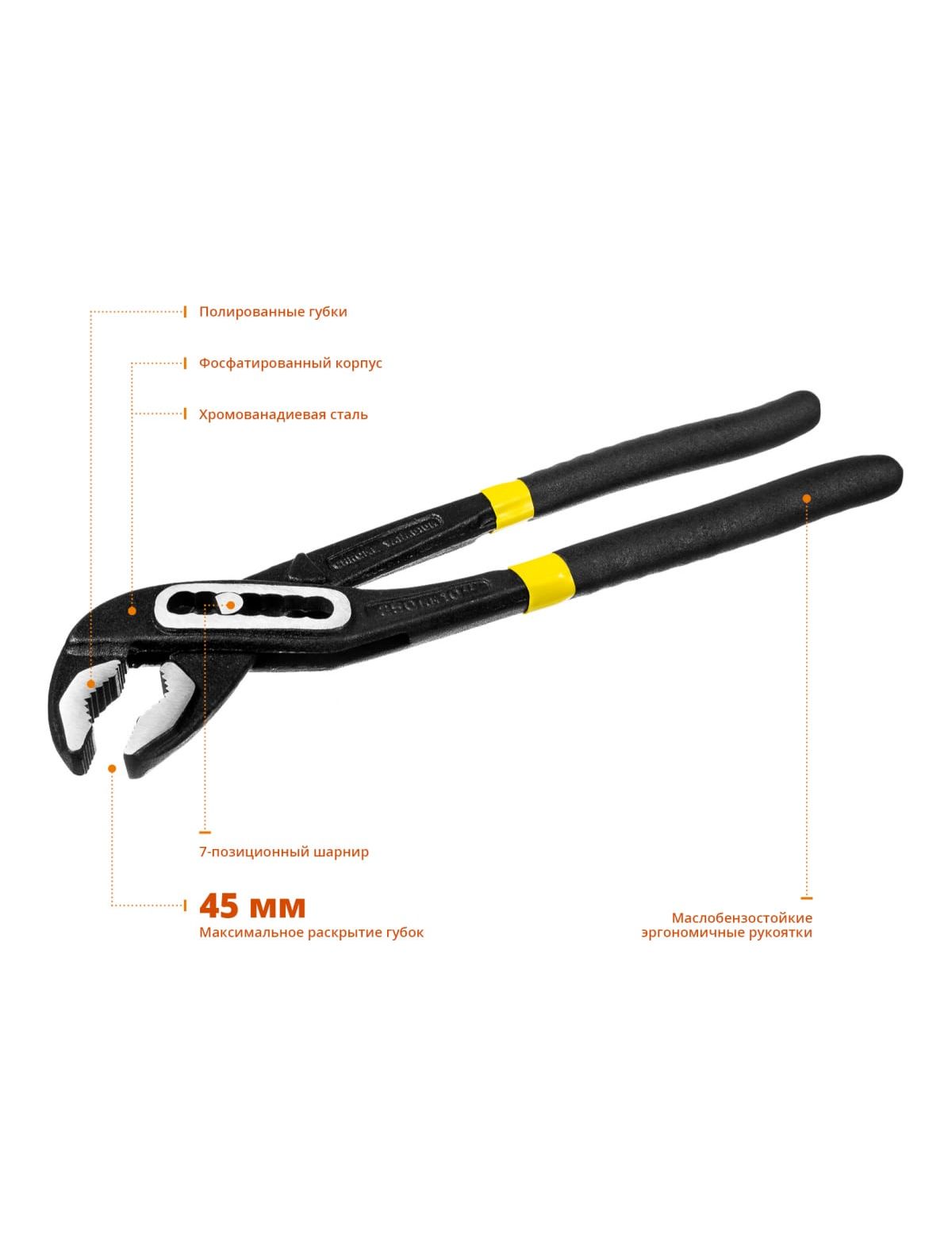 Клещи переставные STAYER 22375_z01 применяются в области слесарно-монтажных работ. С их помощью осуществляется фиксация и вращение фитингов, труб и другие операции. Зажимные поверхности губок оснащены пазом для захвата и удержания проволоки, гвоздей. Рабочая часть выполнена из высокопрочной хромванадиевой стали. Обливные обрезиненные рукоятки имеют эргономичную форму, надежно и удобно лежат в руке.
