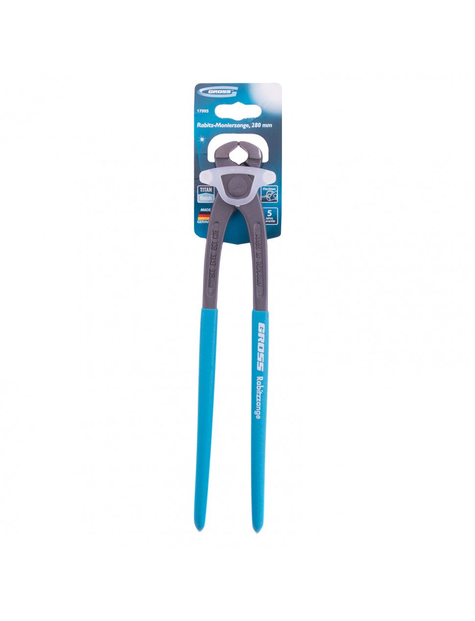 Клещи торцевые, обливные рукоятки 280 мм GROSS 17993 используются для перекусывания стальной проволоки, извлечения гвоздей и других слесарно-монтажных работ. Рекомендуется применять инструмент для работ с жесткой проволокой диаметром до 2,2 мм и проволокой средней жесткости диаметром до 3,6 мм. Рабочая часть изделия изготовлена из стали, режущие кромки закалены индукционными токами, на металлическую основу нанесено антикоррозийное покрытие. Это обеспечивает повышенную прочность и износоустойчивость инструмента.