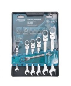 Набор комбинированных трещоточных шарнирных ключей MATRIX 6 шт 14897 имеют возможность менять угол наклона ключа относительно его рабочей накидной части (0–180 градусов). Инструменты изготовлены из прочной хромованадиевой стали для долгого срока службы. А хромоникелевое покрытие защищает ключи от...
