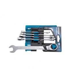 Набор комбинированных трещоточных ключей 5 шт 8-17 мм GROSS 14858 используется для обслуживания резьбовых соединений. Ключи имеют двухстороннюю конструкцию, где с одной стороны расположена усиленная рожковая головка, а с другой — накидная трещоточная со 100 зубьями. Инструменты обеспечивают...