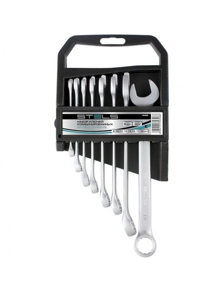 Набор комбинированных ключей 6-22 мм 12 шт матовый хром STELS 15429 включает в себя большое количество двусторонних гаечных ключей, сочетающих в себе кольцевые и рожковые головки. Каждый инструмент изготовлен из прочной и качественной стали и обработан антикоррозийным составом. Комплект подходит для использования дома, в гараже, мастерской, автосервисе и пр.
