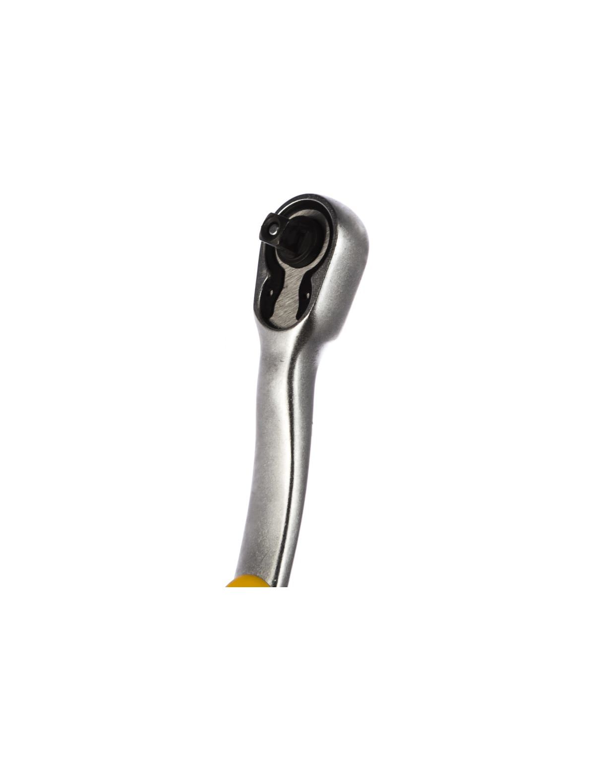 Изогнутая трещотка для торцовых головок 1/4, Сr-V, 72 зубца Kraftool PRO 27795-1/4_z02 обладает высоким рабочим ресурсом, подходит для использования в профессиональных ремонтных мастерских. Изделие имеет цельнометаллический корпус с хромированной поверхностью. Прорезиненная рельефная рукоятка удобно лежит в руке в процессе крепежнх работ. Инструмент служит для работы с торцевыми головками, которые соединяются при помощи квадрата 1/4" с подпуружиненным шариковым фиксатором.