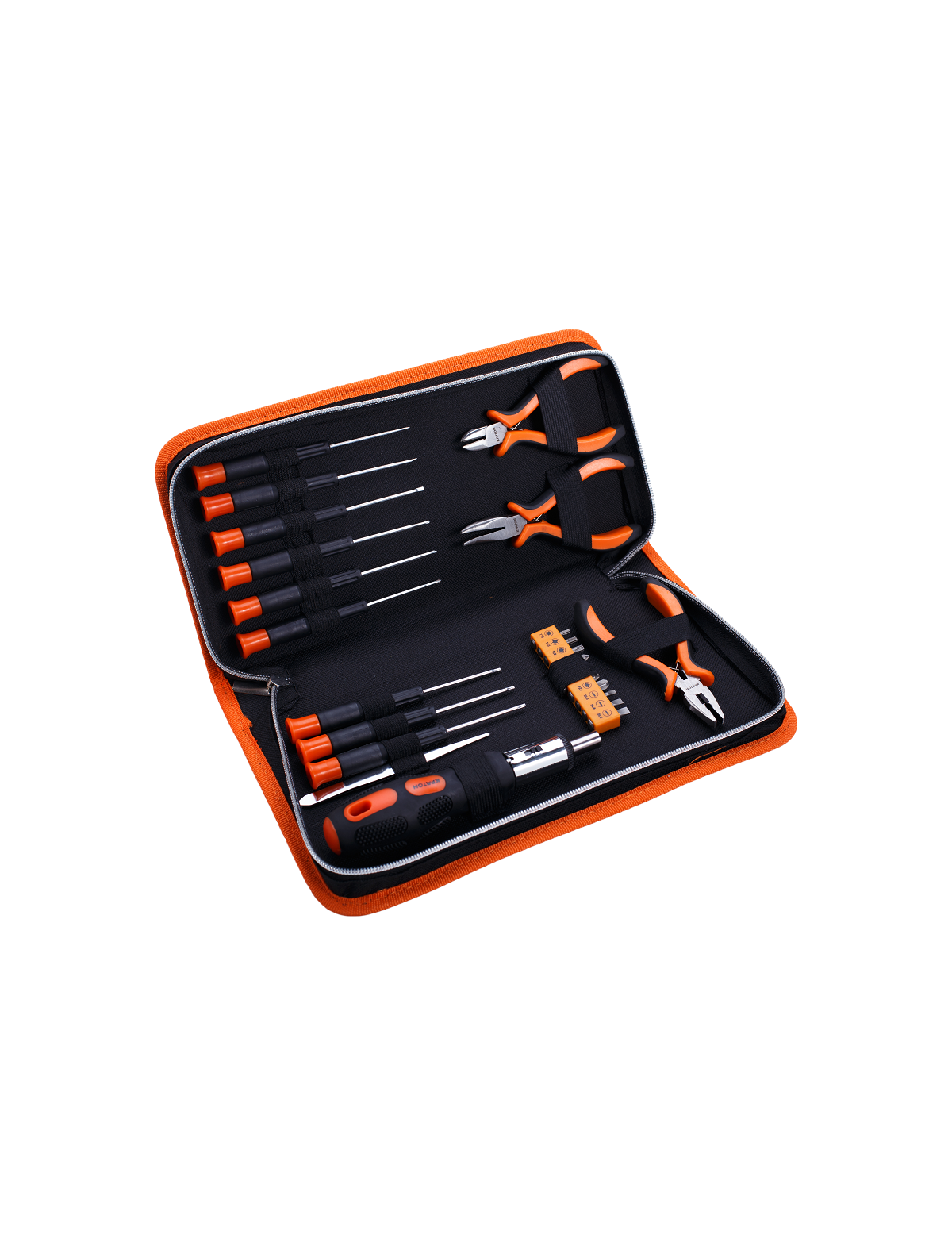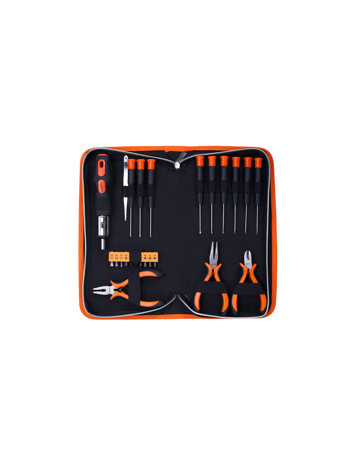 Набор для точных работ Кратон MN-02/23 2 12 17 002 представляет собой небольшой чехол с инструментами, который легко носить с собой. Комплект включает в себя бокорезы и тонкогубцы серии Mini. Крестовые отверки PH предназначены для точных работ. Для монтажа и демонтажа крепежных элементов элементов типа Torx также имеются отвертки. Набор инструментов упакован в удобном чехле, дополнен набором бит в отдельном холдере. Каждый инструмент закреплен на своем месте эластичной лентой.