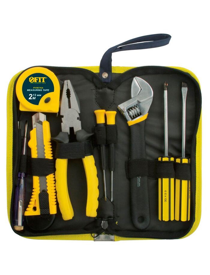 Набор инструментов FIT 65139 состоит из 9 предметов: отверток, рулетки, технического ножа, пассатижей, разводного ключа, индикаторной отвёртки. Эти инструменты пригодятся как в быту, так и в мастерской. Они изготовлены из усиленной инструментальной стали и имеют долгий срок службы. Комплект поставляется в нейлоновой сумке.