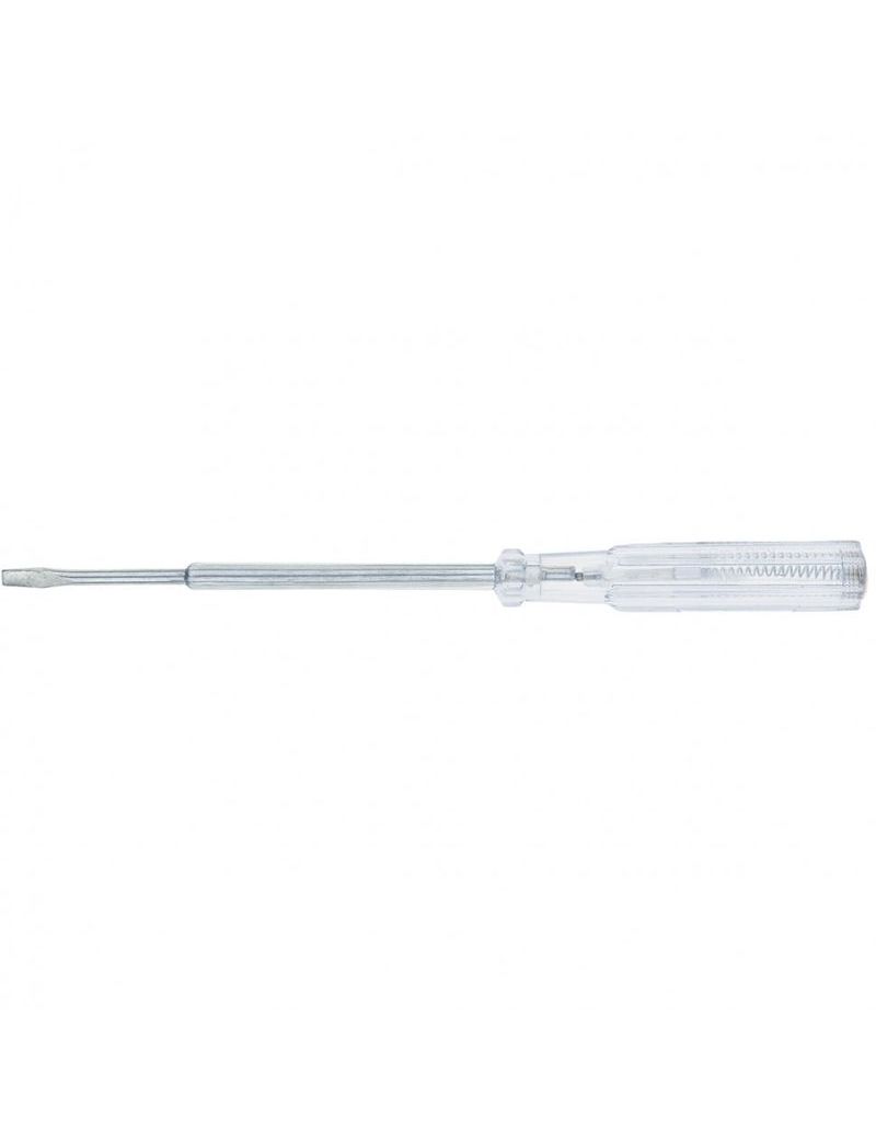 Электрический пробник 190 мм, 100–500 В SPARTA 130605 представляет из себя отвертку с изоляционным покрытием, на конце которой расположен стальной стержень с прямым жалом. Используется для определения наличия электрического тока напряжением от 100 до 500 В. Прозрачная рукоятка из ацетилцеллюлозы защищает инструмент от механического и химического воздействия.