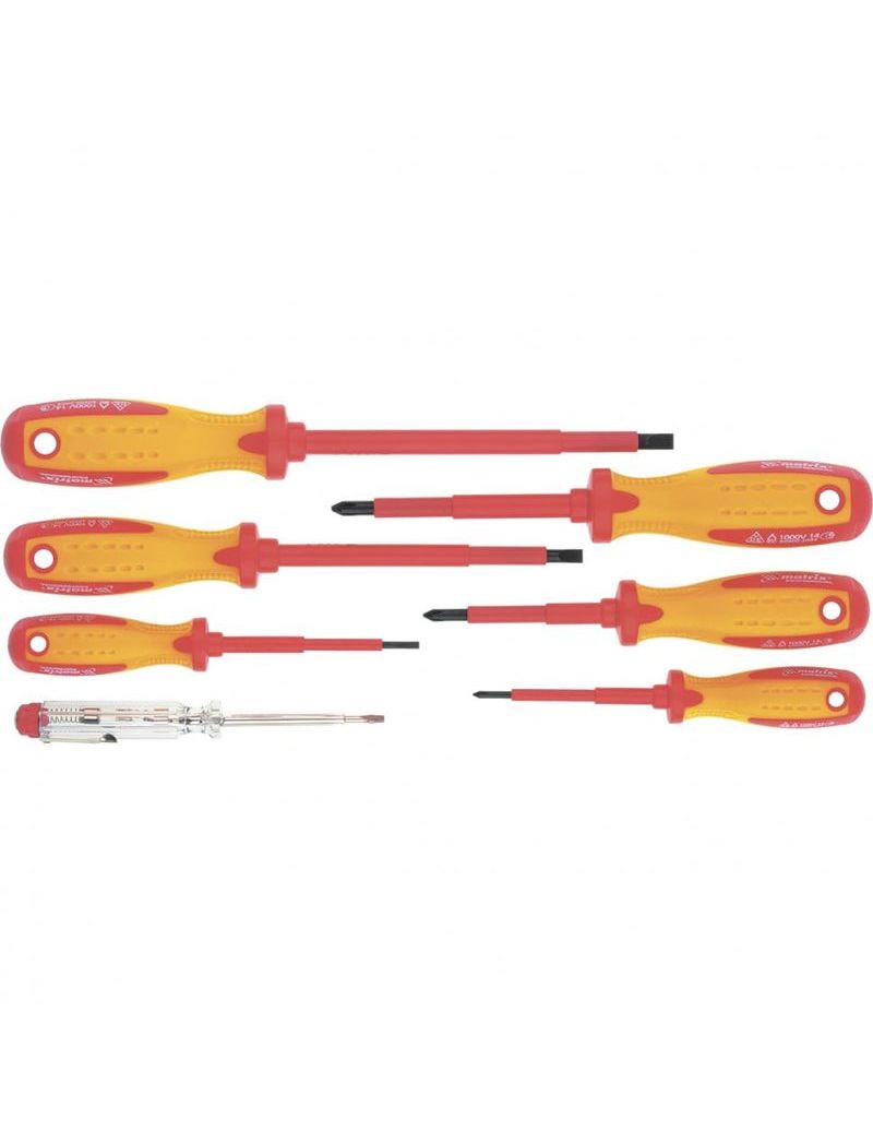 Набор диэлектрических отверток до 1000В, MATRIX PROFESSIONAL 13355 предназначен для работ под напряжением до 1000 В. В наборе 6 отверток ( SL1.2 x 6.5 x150 мм, SL 1.0 x 5.5 x 12 мм, SL 0.5 x 3.0 x 80 мм, РН №0 х 75 мм, РН №1 х 75 мм, РН №2 х 100 мм ) и отвертка-пробник (напряжение 120–250 В). Имеют удобную рукоятку, стержень отверток намагничен.