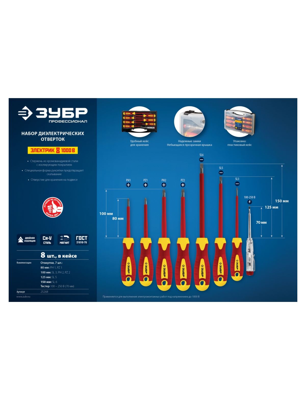 Набор диэлектрических отверток Зубр 25268 представляет собой профессиональный инструмент для работ с резьбовыми соединениями. Все модели имеют удобную форму рукояток. Они не скользят в руке и обеспечивают удобный захват. Набор поставляется в удобном пластиковом кейсе для транспортировки и хранения.