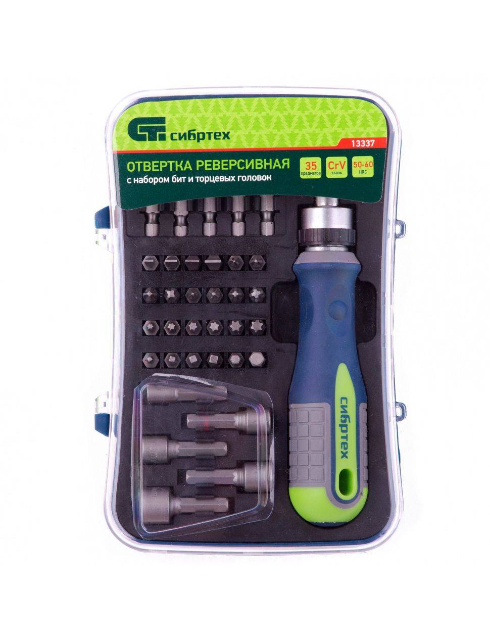 Реверсивная отвертка с набором бит и торцевыми головками, 35 шт. СИБРТЕХ 13337 служит для работ с различными типами соединений. Реверсивная отвертка обеспечивает удобство работы в труднодоступных местах.