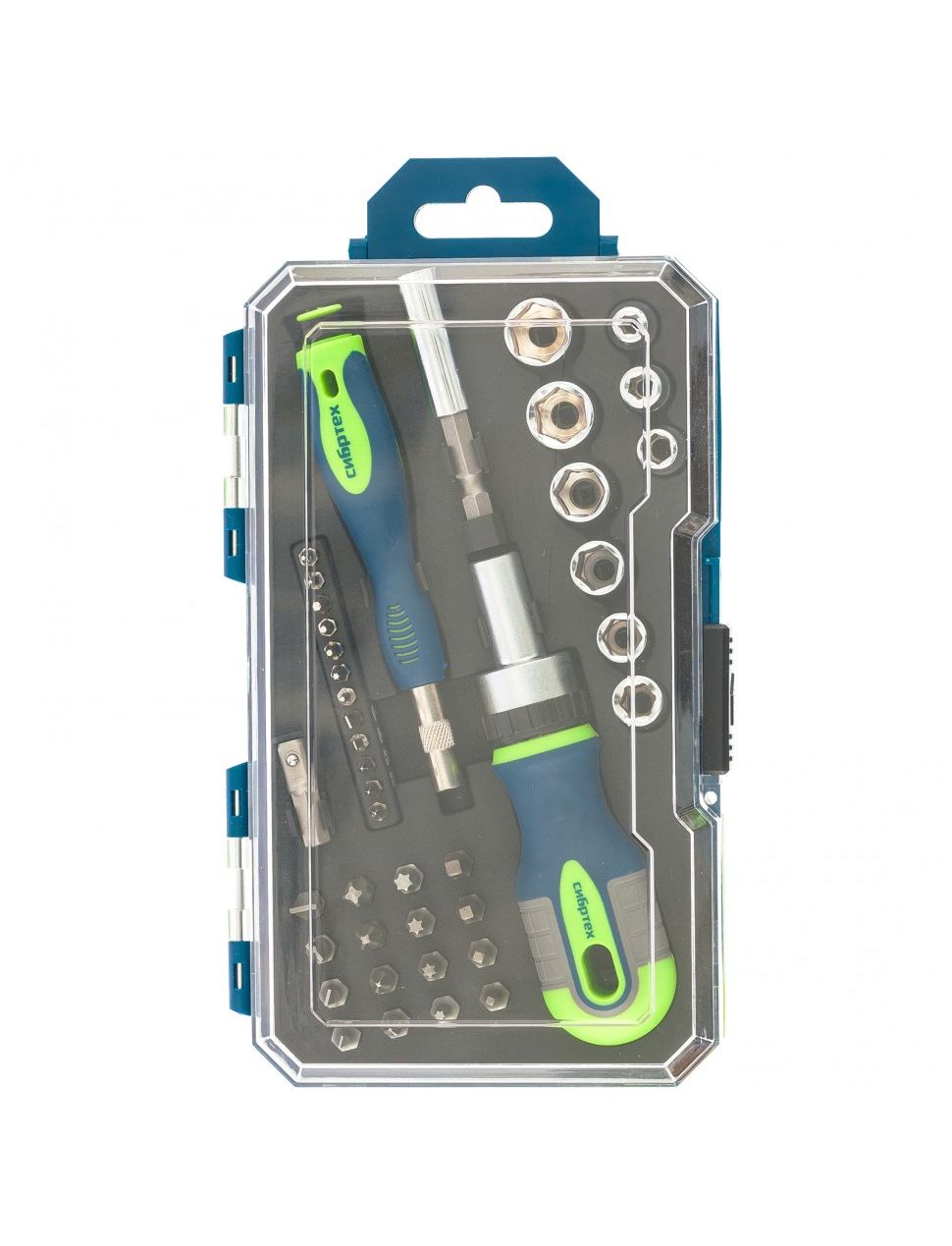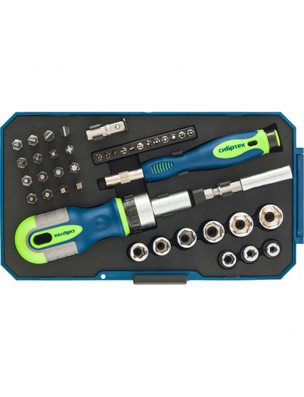 Отвертки реверсивные с набором бит и торцевыми головками, 41 шт. СИБРТЕХ 13338 служит для работ с различными типами крепежных соединений. Пластиковый кейс обеспечивает удобство хранения инструмента. В набор входит отвертка для работ с электроникой, часами и другими мелкими соединениями.