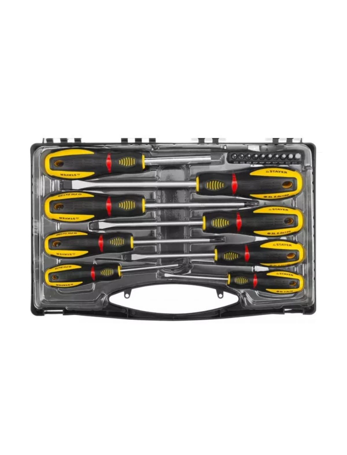 Набор отверток с битами 18 шт STAYER 25133-H8_z02 включает в себя самые популярные типоразмеры шлицов. Предназначен для профессионального использования. Все модели оснащены двухкомпонентными эргономичными рукоятками. Они не скользят в руке и обеспечивают удобный захват.