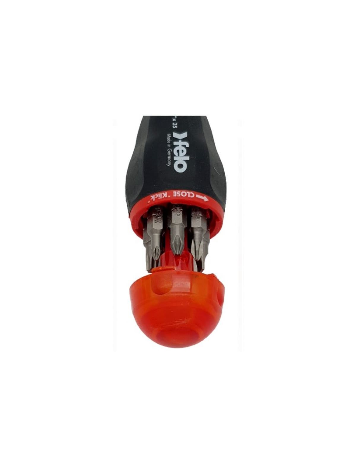 Отвертка с магнитным держателем под биты с набором бит 8шт. Felo 37320805 - универсальный инструмент для работ с крепежом разного вида. На рукоятке расположен магазин, где находятся 8 бит разных типов. Повернув крышку на рукоятке, можно легко открыть и закрыть магазин. Двухкомпонентная рукоятка отличается прочностью, как и надежные насадки, изготовленные из хром-молибден-ванадиевой стали.