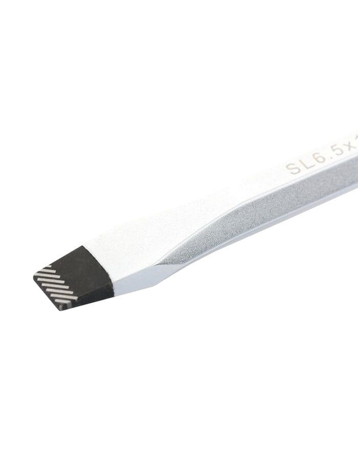 Отвертка GROSS SL6.5x100 мм 12116 предназначена для работы с резьбовыми соединениями, имеющими плоский шлиц. Максимальный крутящий момент затяжки достигает 6.5 Нм. Стержень изготовлен из прочной инструментальной стали S2 и имеет хромовое покрытие для защиты от коррозии. Благодаря насечкам на жале увеличивается трение между отверткой и шлицом крепежа, что препятствует его повреждению. Удобная форма трехкомпонентной рукоятки обеспечивает надежный хват.