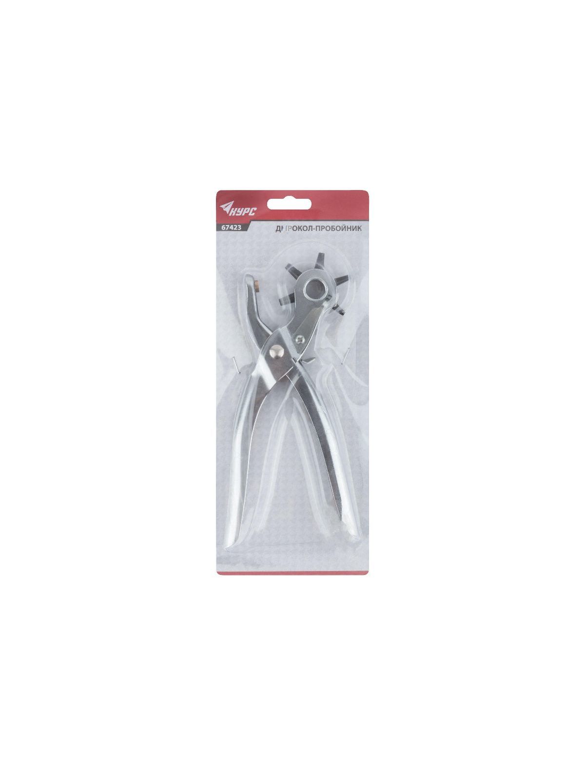 Дырокол-пробойник КУРС 67423 с револьверной головкой (отвер. 2-2,5-3-3,5-4-4,5 мм ) Револьверный дырокол оснащается фиксатором для безопасного использования. Используется для быстрого и аккуратного прокалывания одинаковых отверстий в ткани, картоне, коже, резине, пластике и других материалах. Механизм инструмента имеет трубчатые конические пуансоны диаметром от 2 от 4,5 мм.