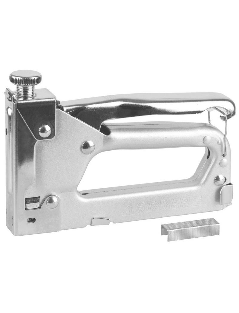 Регулируемый скобозабивной металлический степлер STAYER MASTER 3150_z01 широко используется во время столярных работ для закрепления материала, например, из гипсокартона, пластика, ДСП и т.п. к другим поверхностям. Рассматриваемый степлер имеет регулировку силы удара, что позволяет выбрать нужную, в зависимости от плотности материала.
